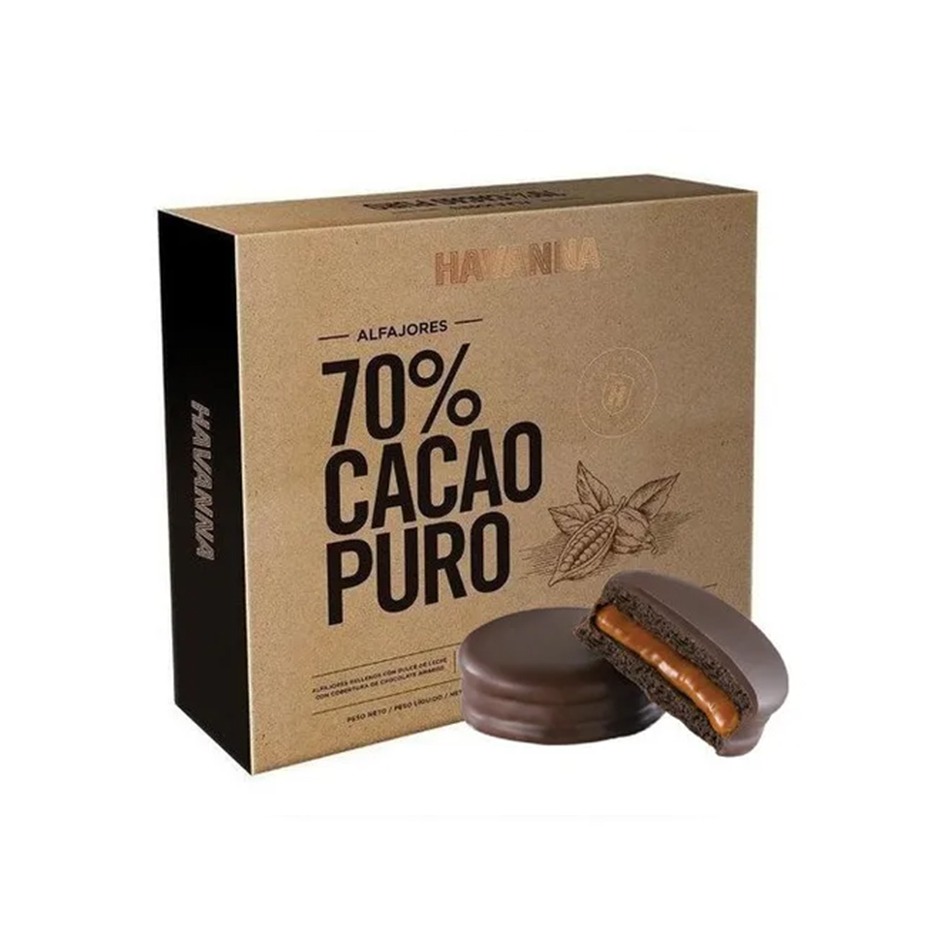 Para los amantes del chocolate intenso: alfajores Havanna con cobertura de cacao puro 70% y relleno de dulce de leche tradicional. Un lujo argentino en cada bocado.